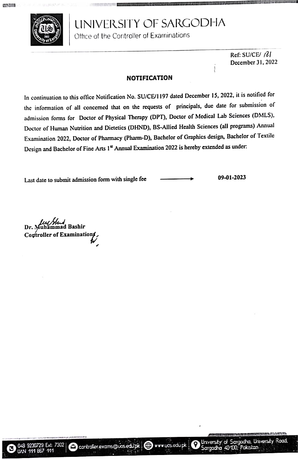 Admission Schedule: DPT, DMLS, DHND, BS AHS Supplementary Exam, 2022 and Pharm-D, BGD, BTD, BFA 2nd Annual Exam 2022 10-06-2023 Download