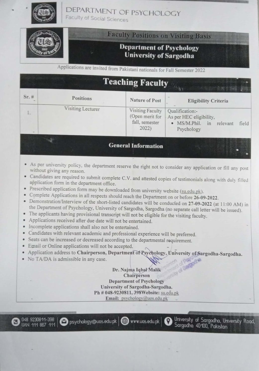 | Visiting Faculty Required (Department of Psychology) | 22-09-2022