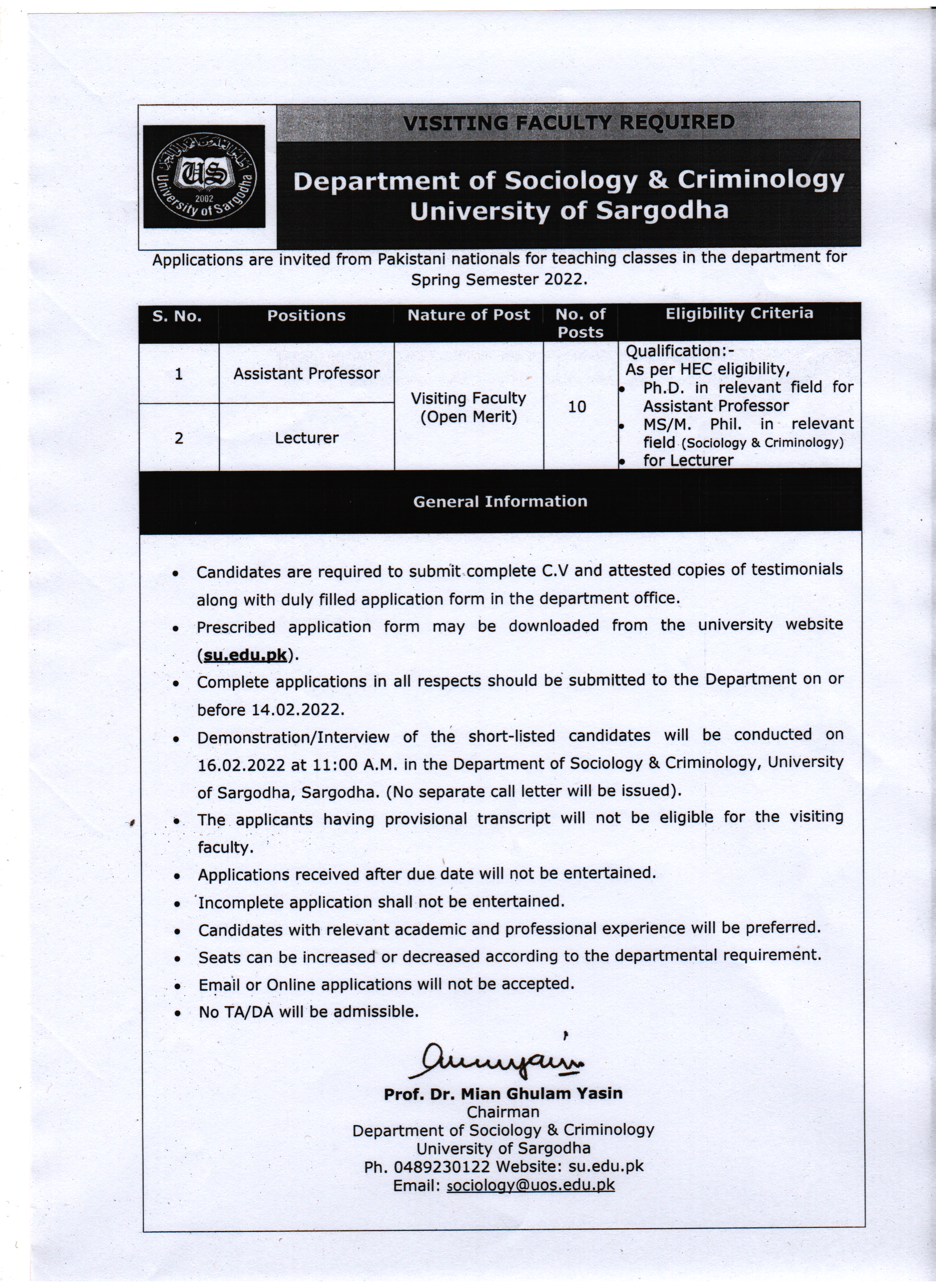| Visiting Faculty Required - Spring 2022 (Department of Islamic Studies & Statistics, Sub-Campus Bhakkar) | 09-02-2022