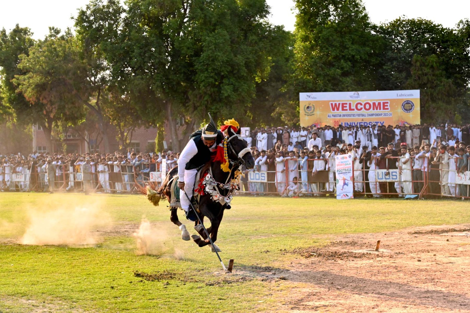 Sargodha, 23 April, 2024. A colorful opening ceremony of 20th University Sports Gala and the 15th All Pakistan Football Championship (Final Round) mesmerized the audience at university of Sargodha on Tuesday.