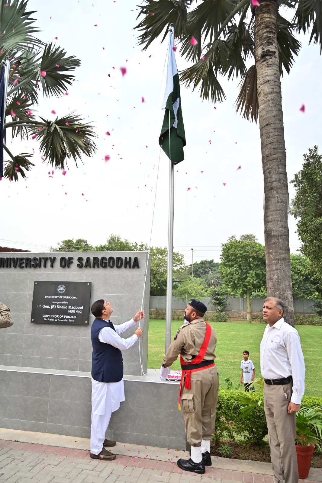 The ceremony began with a Guard of Honor by the University Security Wing, followed by the flag hoisting performed by Vice Chancellor Prof. Dr. Qaisar Abbas, accompanied by Pro Vice Chancellor Prof. Dr. Masood Sarwar Awan, Registrar Waqar Ahmad, deans, directors, academic and administrative heads, faculty, staff, students, and children. A cake-cutting ceremony was also held to mark the joyous occasion.